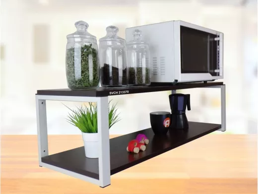 • Полка надежно крепится к стене при помощи анкеров или шурупов с дюбелями, на ней можно разместить микроволновую печь, кухонную технику, посуду, специи