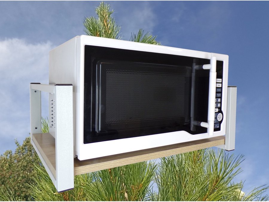 - Полка надежно крепится к стене при помощи анкеров или шурупов с дюбелями, на ней можно разместить микроволновую печь, кухонную технику, посуду, специи
