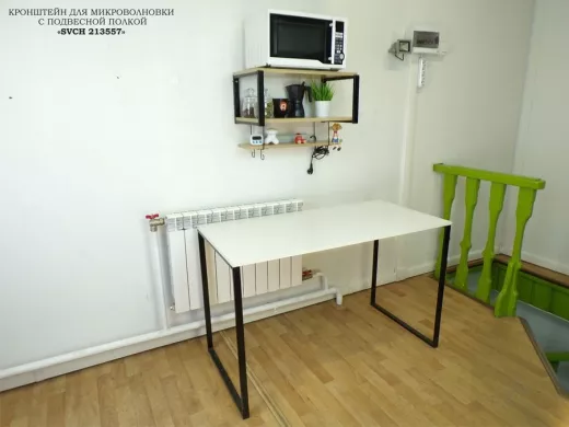 - Полка надежно крепится к стене при помощи анкеров или шурупов с дюбелями, на ней можно разместить микроволновую печь, кофемашину, тостер идр.кухонную технику, посуду, специи, различные необходимые мелочи