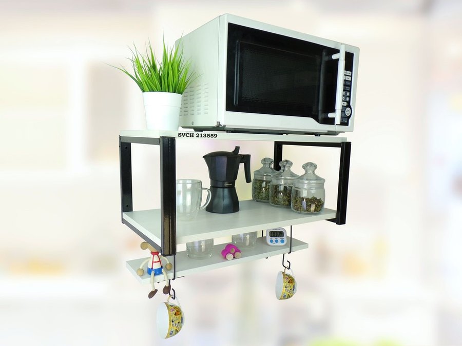 - На верхней полке можно разместить микроволновую печь или другую кухонную технику, на средней отлично "встанет" посуда, баночки под сыпучее и многое другое, а нижняя полка отлично подойдет для специй, таймера или маленьких сувениров
