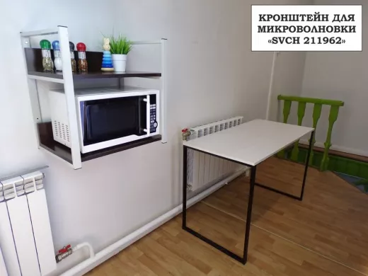 • Полка надежно крепится к стене при помощи анкеров или шурупов с дюбелями, на ней можно разместить микроволновую печь, тостер, кофемашину, чайник, посуду, специи